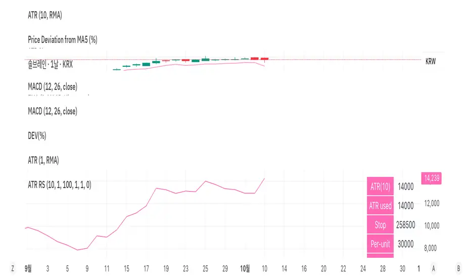 • Purpose: A compact risk-sizing helper that plots Daily ATR(10, RMA) in a separate panel and shows a live sizing summary (ATR used, Stop, Per-unit risk, Risk, Size, Bet). Works on any chart timeframe.