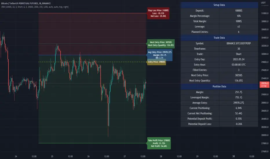 The indicator will also automatically keep track of the total margin employed according to each filled entry, the cumulative average entry price of the ongoing trade and its associated RR ratio.