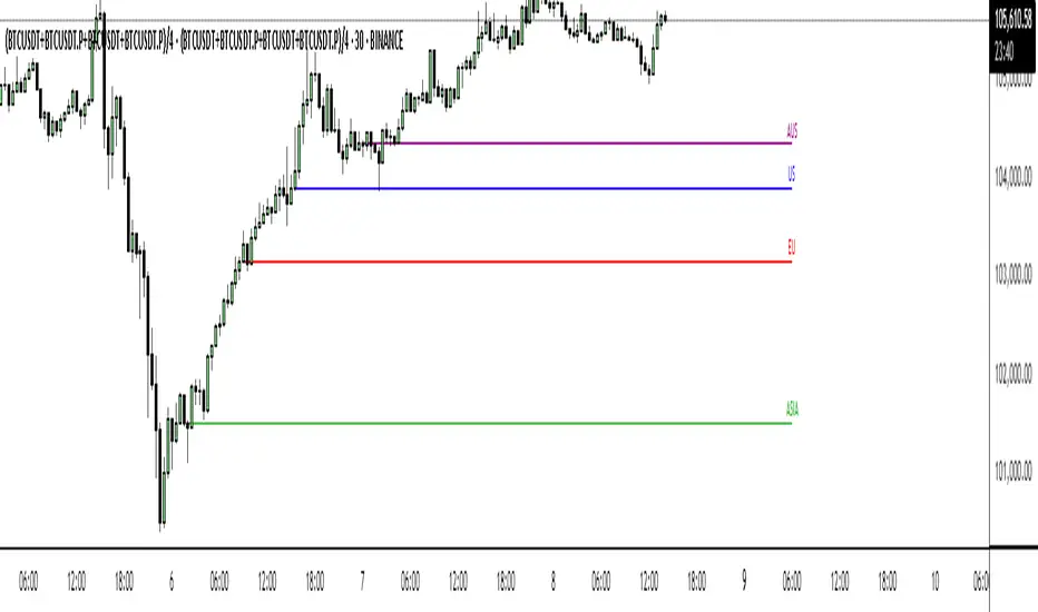 Intelligent Time Detection - The indicator continuously monitors for precise market opening times across four major global sessions (EU, US, ASIA, AUS) using advanced Pine Script time functions that work seamlessly across all timeframes.