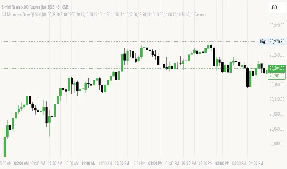 This indicator draws customizable vertical lines at specific Eastern Time (EST/EDT) points throughout the trading day, automatically adjusting for daylight savings time. Designed for precision trading on 1-minute and 5-minute charts, it highlights key intraday moments when price action tends to accelerate.