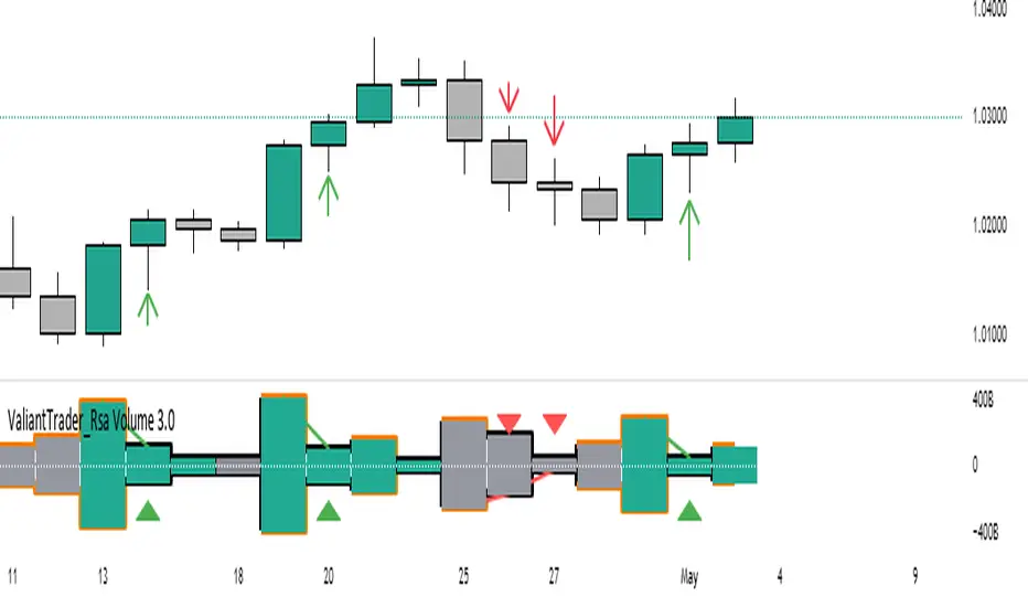 -Green arrows up below volume bars indicates a buy for a current day and Red arrows down above volume bars indicates a sell for a current day.