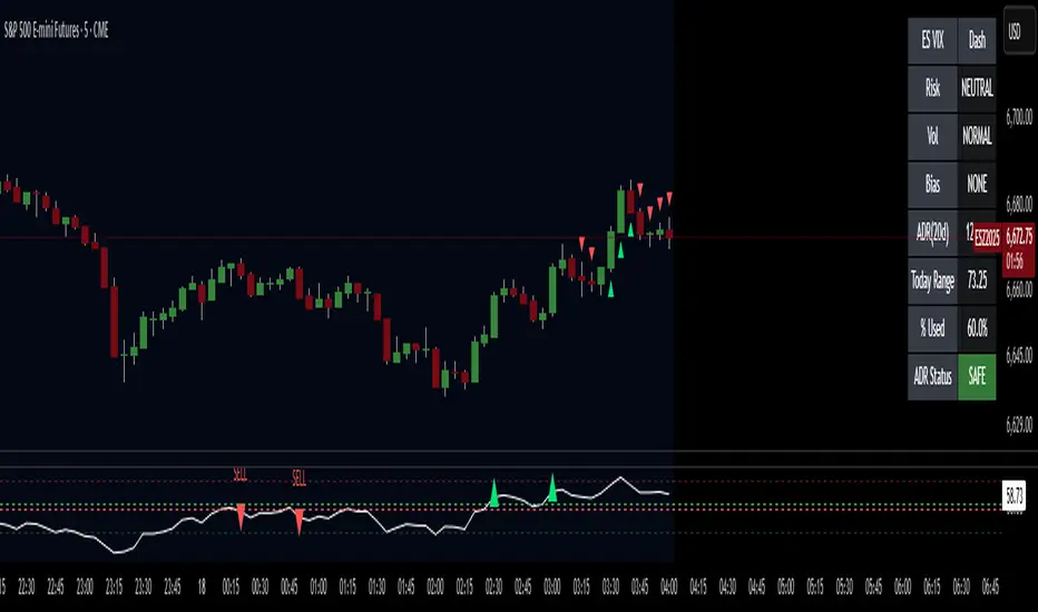For all the S&P500 Traders the Vix Dashboard with Built in ADR that Informs of safe to trade or not self expletory also plots buy and sell on the chart in the Form of a Triangle very useful for the ES any timeframe