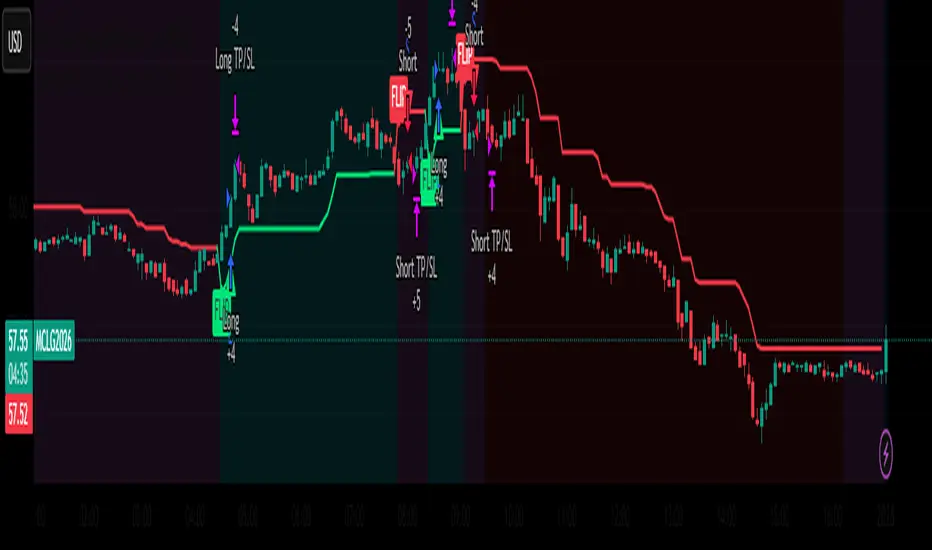 The result is a regime-based trend strategy that uses ATR trailing bands to detect directional flips, confirmed with a two-bar hold filter, and automatically routes alerts to brokers for live execution.
