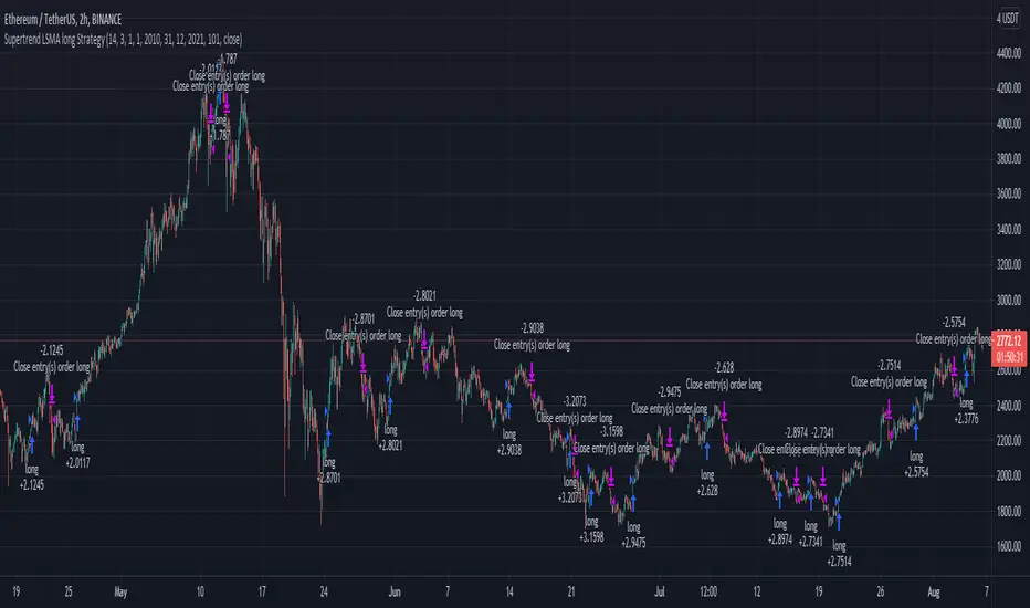 This is a long strategy which combines Super trend indicator with LSMA moving average.