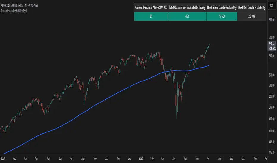Dynamic Gap Probability Tool measures the percentage gap between price and a chosen moving average, then analyzes your chart history to estimate the likelihood of the next candle moving up or down. It dynamically adjusts its sample size to ensure statistical robustness while focusing on the exact deviation level.