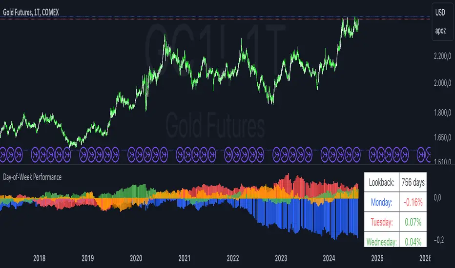 This indicator helps visualize day-of-the-week performance trends, providing insights into which days typically perform better or worse over the specified period.