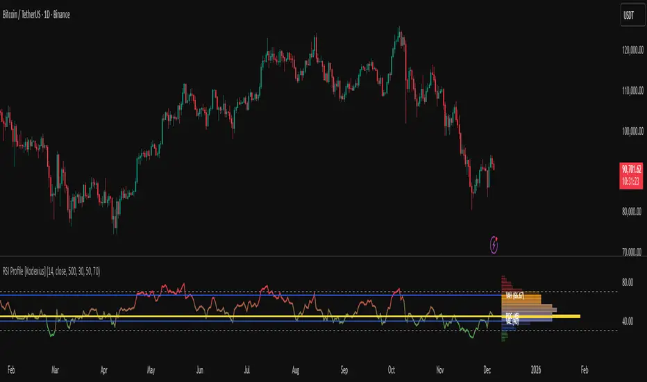 RSI Profile is an advanced technical indicator that turns the classic RSI into a distribution profile instead of a single oscillating line. Rather than only showing where the RSI is at the current bar, it displays where the RSI has spent most of its time or most of its volume over a user defined lookback period.
