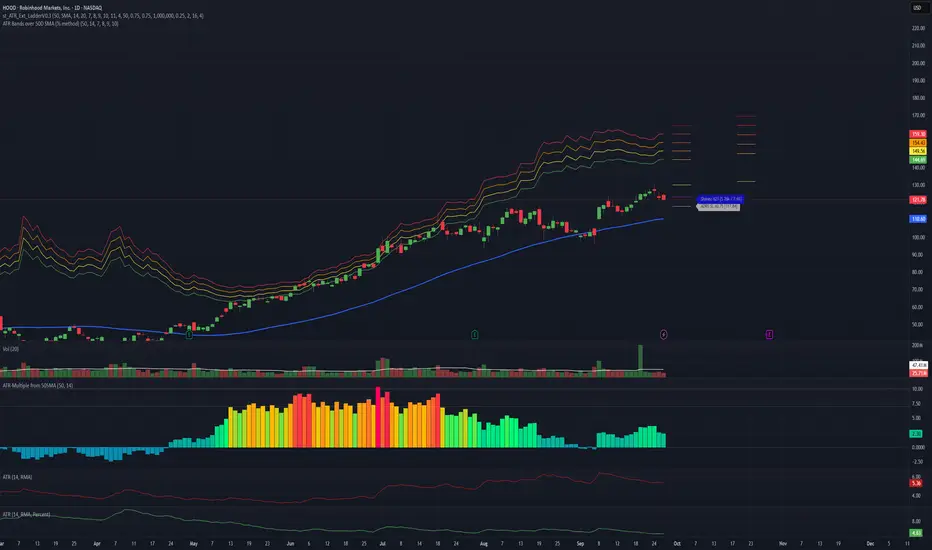 Indicator that shows multiples of ATR% above the 50d SMA as bands on a chart, building off of