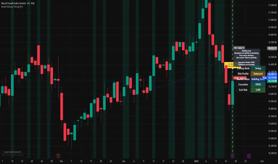 Smart Money Timing Pro is a market-context and timing indicator designed to classify when market conditions are supportive for participation and when risk is elevated.