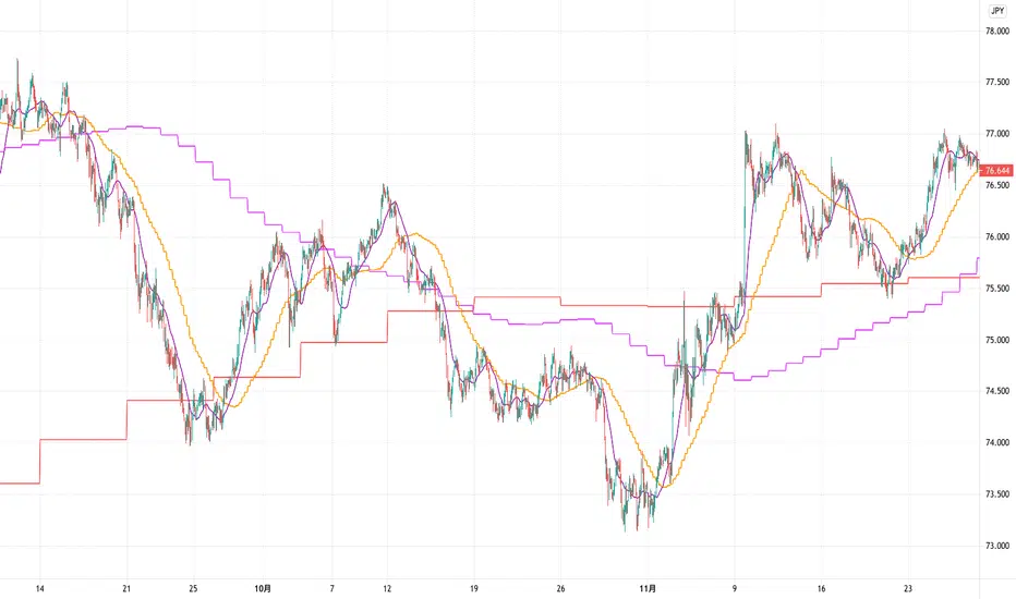 上位足の移動平均線を下位足に表示することで、上位足での目線を持ったまま下位足の分析を行ったり、上位足によるレジサポの判断に使うことを想定しています。