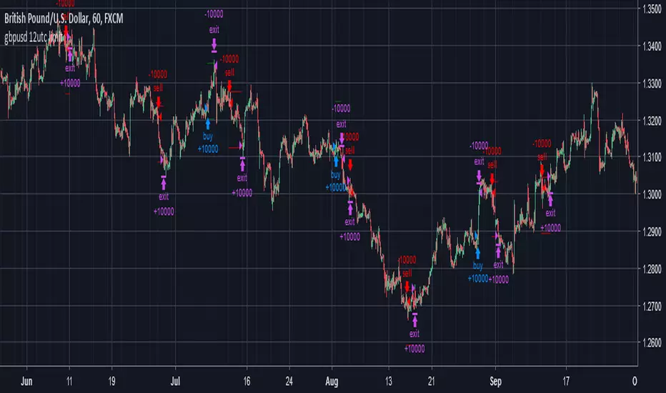 Everyday at 12 utc check the chart for a signal. If it appears you can set the Stop Loss 30 pips and Take Profit 120 pips from the open of the candle, and let it run! Green and red lines will be generated to see these limits.