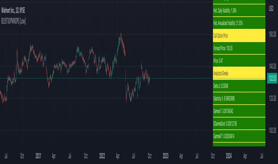 Black-Scholes 1973 OPM on Non-Dividend Paying Stocks [Loxx] is an adaptation of the Black-Scholes-Merton Option Pricing Model including Analytical Greeks and implied volatility calculations. Making b equal to r yields the BSM model where dividends are not considered. The following information is an excerpt from Espen Gaarder Haug's book "Option Pricing Formulas". The options sensitivities (Greeks) are the partial derivatives of the Black-Scholes-Merton ( BSM ) formula. For our purposes here are, Analytical Greeks are broken down into various categories: