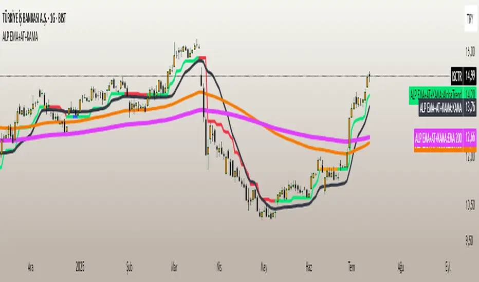 This indicator is a powerful combination of two adaptive trend-following concepts: the AlphaTrend by Kivanc Ozbilgic and the Kaufman's Adaptive Moving Average (KAMA), often credited to Perry Kaufman (with the specific implementation based on HPotter's interpretation of KAMA).