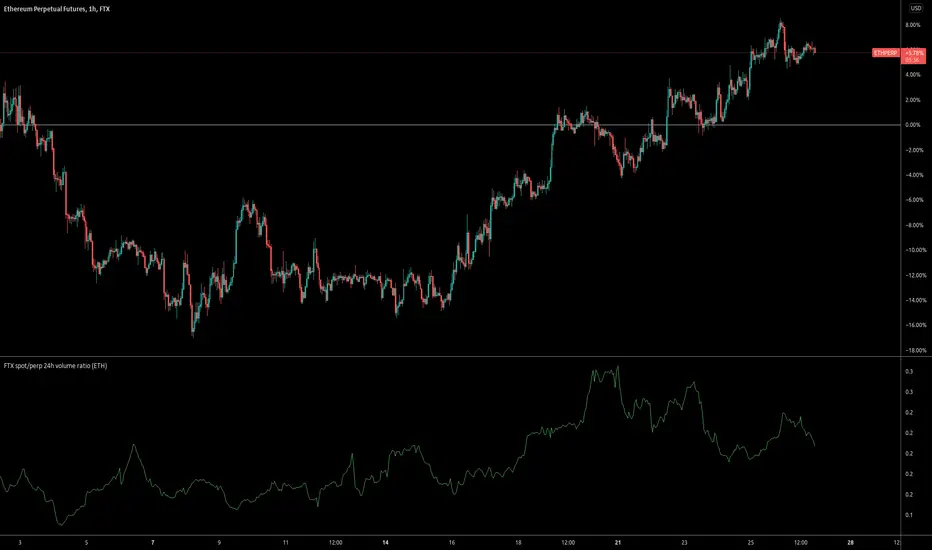 This indicator gives the ratio between the 24h volume on the spot instrument versus the perpetual contract on FTX.