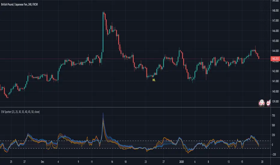 The Trend EW Spotter is a momentum based indicator that is used in a Guppy style analysis to identify the repeating patters seen in the indicator to help identify specific waves of Elliot Wave analysis.