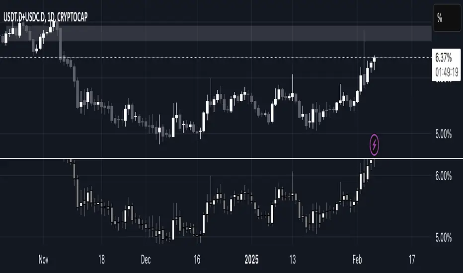 This indicator combines the dominance of USDT (USDT.D) and USDC (USDC.D) to track total stablecoin market share across all timeframes. It displays the combined dominance as candlesticks, providing a clearer view of market liquidity shifts and investor sentiment.