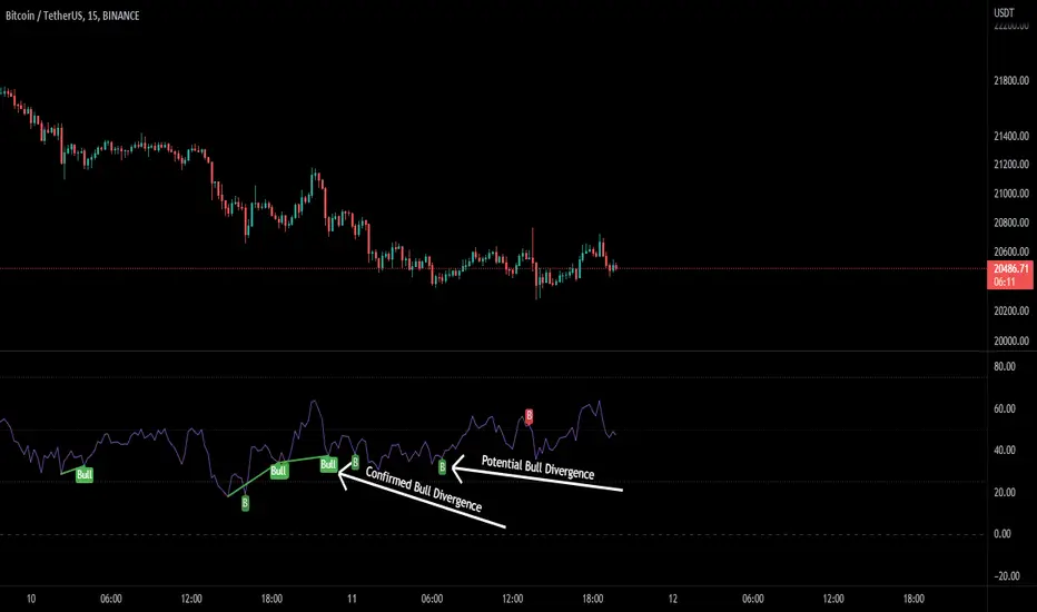 Potential divergence is confirmed when the line and the label "Bear"' or "Bull" appear.