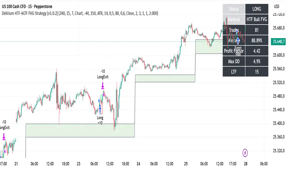 The strategy is built around Fair Value Gaps (FVGs), market structure confirmation, and liquidity objectives. A key feature is the detection of Higher Timeframe Fair Value Gap failures. When a HTF FVG is not respected and price breaks through it, Delirium assumes that liquidity will be sought elsewhere, either on the buy-side or sell-side, depending on context.
