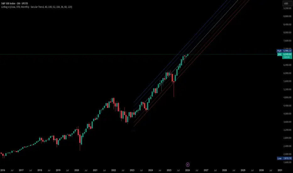 This indicator applies multi-sigma linear regression across multiple institutional time horizons to quantify the line of best fit in equities and index markets. By combining multi-timeframe presets with statistically derived deviation bands, it highlights trend structure, volatility expansion, and regime transitions with clarity.