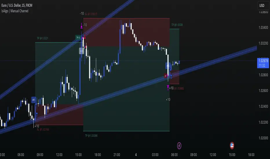 The Manual Channel strategy is based on the use of manually defined channel lines to guide trading decisions. Traders start by marking four key points on the chart to create the channel. The first two points share the same time but different prices, and the last two points also share the same time but different prices. This method allows traders to place the channel lines precisely based on their analysis and insights. Additionally, the strategy allows for adjusting the width of the channel lines, which acts as a buffer zone around the main lines.