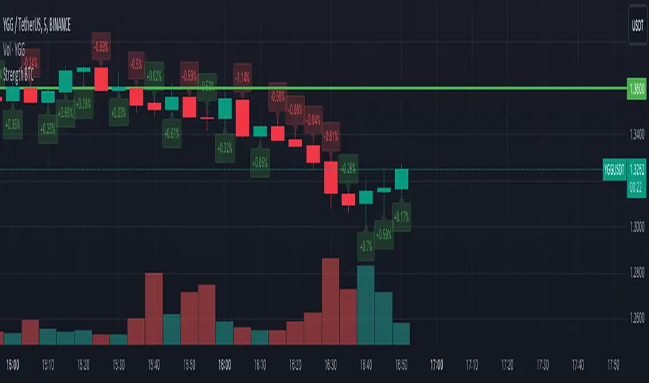 This simple indicator plot for every candle a % difference referred to the corresponding BTCUSDT candle, so you can know if the chart is performing better or worse than Bitcoin. Simple as that.Enjoy!