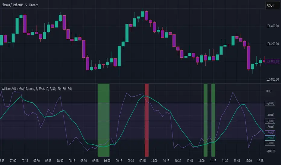 A modernized take on the classic Williams %R oscillator — enhanced with a configurable moving average (SMA, EMA, RMA, WMA, HMA, or KAMA) for trend confirmation. Overbought and oversold zones are fully adjustable, and background highlights appear when momentum shifts: green for bullish crosses in oversold areas, red for bearish crosses in overbought zones.