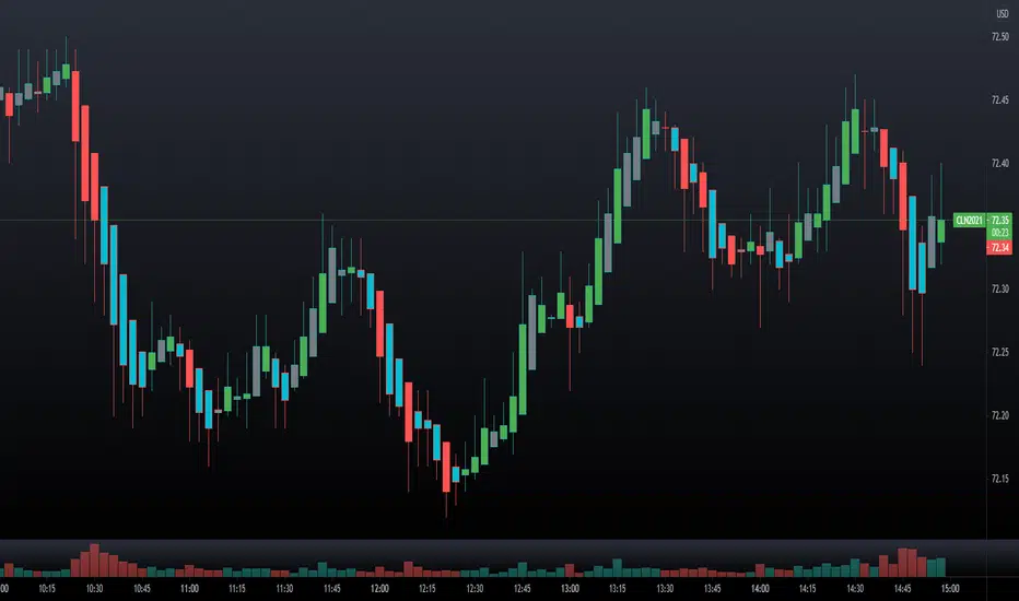 Green Candle - UP candle with increased volume compared to previous candle. A grey candle - UP candle but has less volume than the candle before. A Red candle is a DOWN candle that has increased volume compared to previous candle. A Cyan Candle is a DOWN candle but has less volume than the candle before.