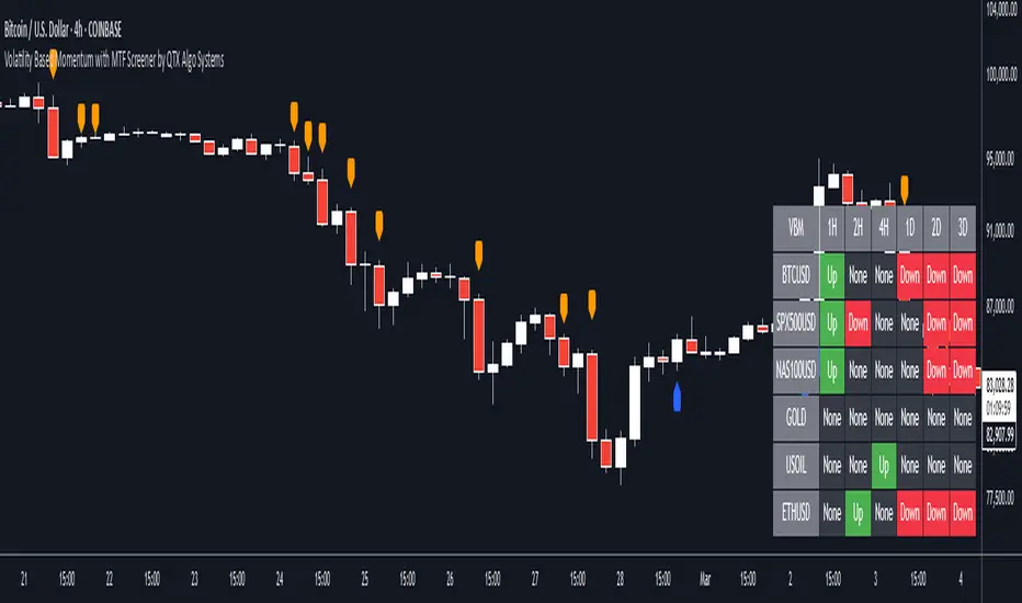 This indicator builds on our original Volatility Based Momentum tool by integrating a Multi Time Frame (MTF) Screener that provides real-time, cross-market momentum analysis. It dynamically adjusts momentum signals using adaptive volatility measurements, ensuring that signals reflect true market strength across various timeframes and assets.