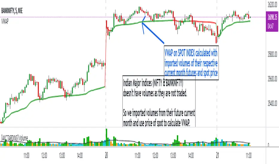 PS: This VWAP indicator works well with all symbols which has volume and added additional volume (from futures) on NIFTY & BANKNIFTY SPOT.