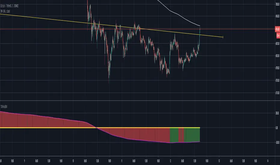 Greenline = Coinvalue smoothed with EMA1 in relation to EMA800 (Means if EMA800 = 10.000$ and CoinValue = 10.200$ the Greenline shows the Difference +200 $ over EMA800