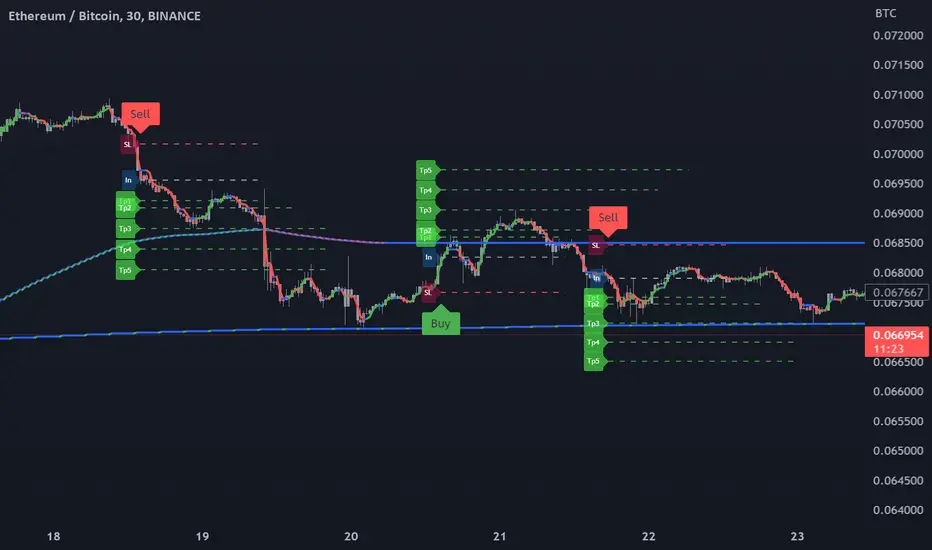 A horizontal take profit line is plotted when buy or sell signals occur.