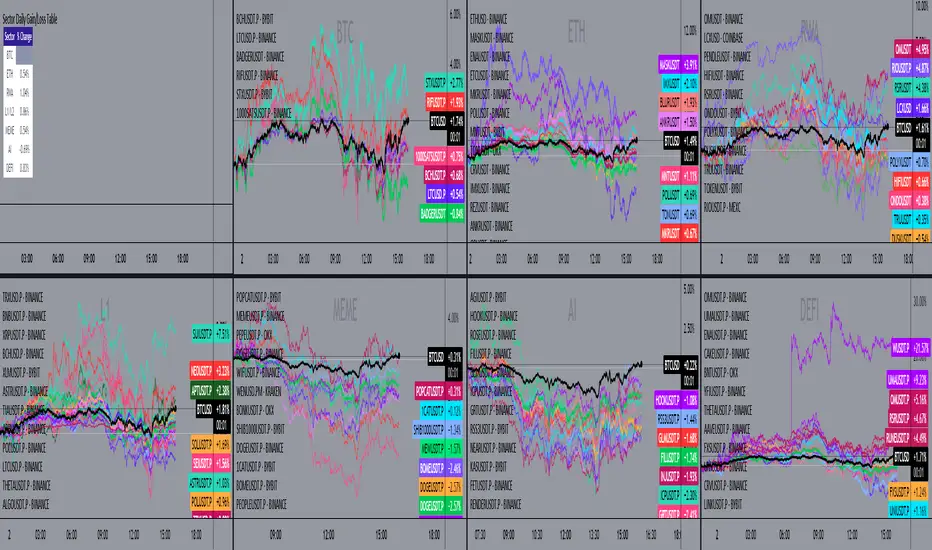 Average Gain/Loss Calculations: For each sector, the indicator calculates the average percentage change in price based on the included cryptocurrencies, offering insights into sector-wide performance trends.