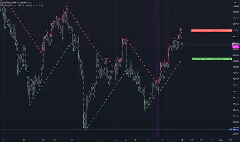 This Pine Script indicator, "PnF Bullish and Bearish Trend line Proximity Alert," overlays on a trading chart to monitor and alert users about interactions with bullish and bearish trend lines derived from Point and Figure (PnF) charting.