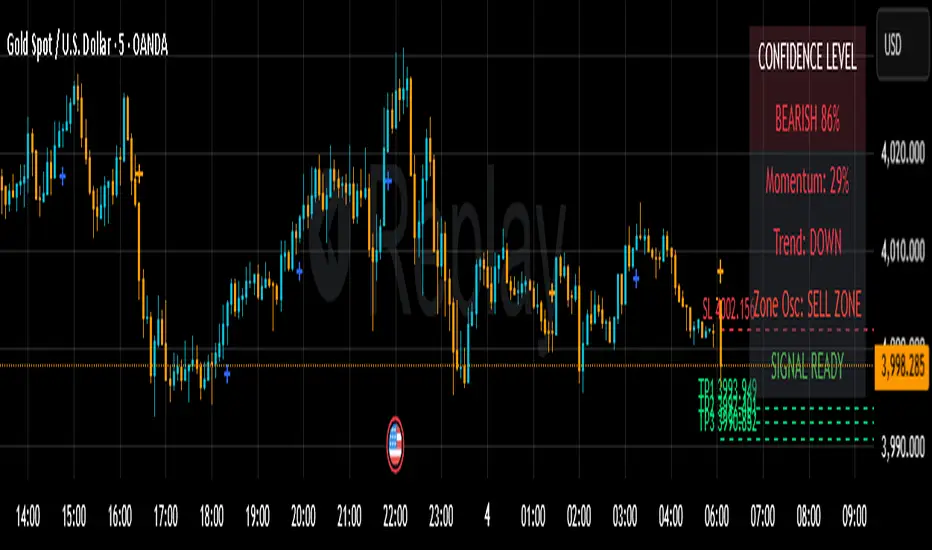 The purpose is to detect high-probability reversal or continuation entries, filter out low-momentum noise, and provide clear visual HUD, TP/SL levels, and alert messages ready for automation or manual trading.