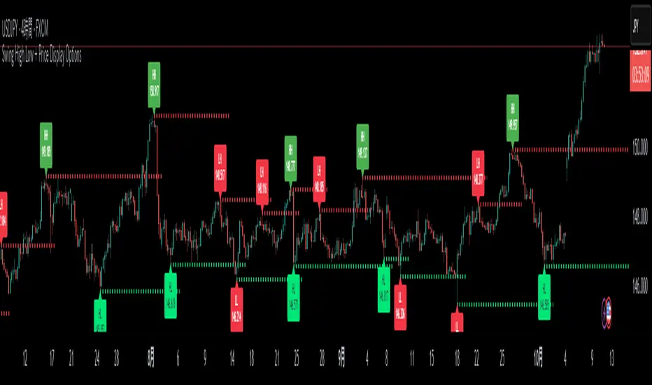 This indicator identifies Swing Highs and Lows (Higher Low, Higher High, Lower Low, Lower High) on price charts and provides multiple visualization options for traders. Users can customize the detection parameters and display preferences to enhance chart analysis.