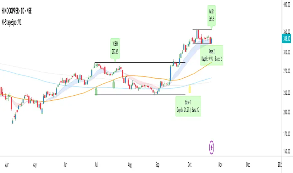 KI-StageSpot identifies Stage 1 to Stage 3 transitions by quantifying weekly base structures instead of relying only on moving average crossovers. Each base is derived from confirmed weekly pivot highs and lows that meet predefined duration and depth criteria. When a new low undercuts the prior base, the logic automatically merges the bases to preserve structural continuity. This framework is designed for traders studying trend evolution and Stage 2 continuation patterns.