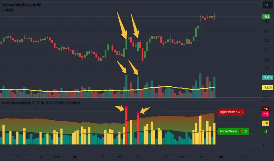The indicator calculates the simple moving average of volume over a certain period of time. This average is used to identify abnormal movements by comparing it with the current volume.