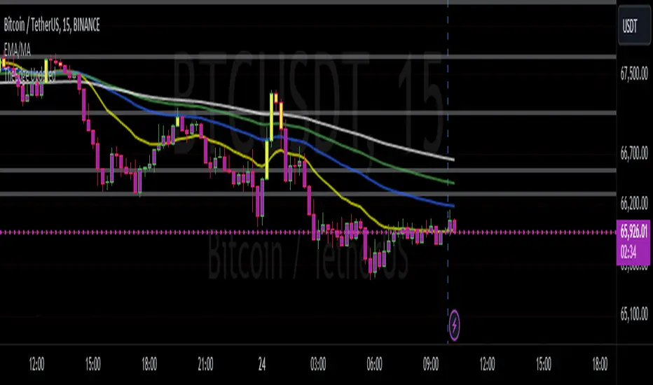 The edge trend indicator script uses exponential moving averages (EMA) cross overs (Death and golden crosses) of the 50 and 200 EMA and positive and negative slopes of the 50 EMA to decide the current trend. The candle sticks are color coded for ease of use and will change color depending on the rules. They will either change yellow when the 50 EMA has a positive slope or has crossed above the 200 EMA to go Long in your position or turn purple when the 50 EMA has a negative slope or crosses below the 200 EMA which indicates to sell and go short. It was designed to be used with the daily or 2 day timeframe in mind.