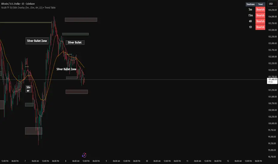 This script overlays the 50 EMA from four higher timeframes (5m, 15m, 4H, 1D) onto your current chart and shows a trend table so you can see at a glance whether each timeframe is Bullish, Bearish or Sideways.