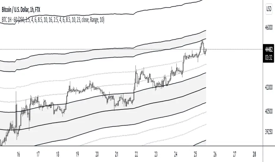 This indicator is built off of the 1 hour time frame. I used the ZigZag indicator to get 500 data points on BTC since last april, ruling out <2% deviations in price. Taking those percentages, I ran them through an excel sheet and found which deviations were the most common. An up/down relationship I will call a rotation, there are 250 rotations derived from the 500 points of data. Thus, this indicator is based off of a 250 EMA. Each band is a common deviation on the 1 hour time frame, as indicated by an excel generated histogram. The common deviations also appear relevant on the daily timeframe for BTC. This demonstrates potential support and resistance, as well as potential mean reversion. Do not take trades blindly based off of it. It merely shows potential support and resistance based off of historical percentage deviations from the 250 EMA.
