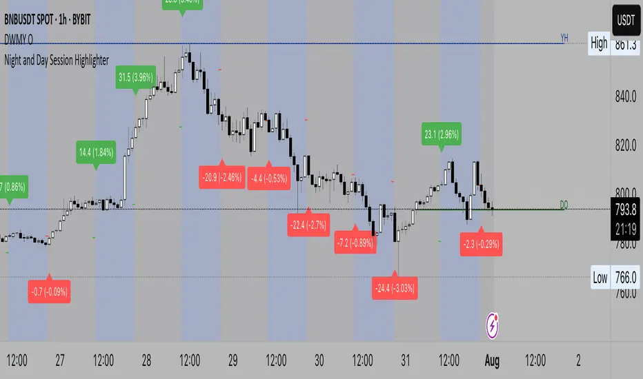 - Этот скрипт разделяет день на вечерние и дневные сессии и показывает изменение цены в процентах.