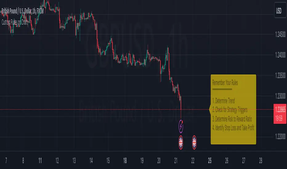 This script allows you to display your custom strategy rules on your chart. It displays a label on the candle cost with the text you specify in the settings. You can have up to 10 lines of text.