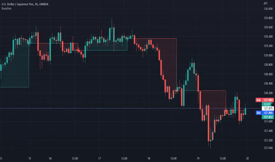My baseline study lets you compare price to the previous days close. You can select the time frame for this baseline. I have included the ability to use a custom period length or your own anchor value. Custom anchor values are great for comparing the price to your cost average. The features I have included are bar color and background color.