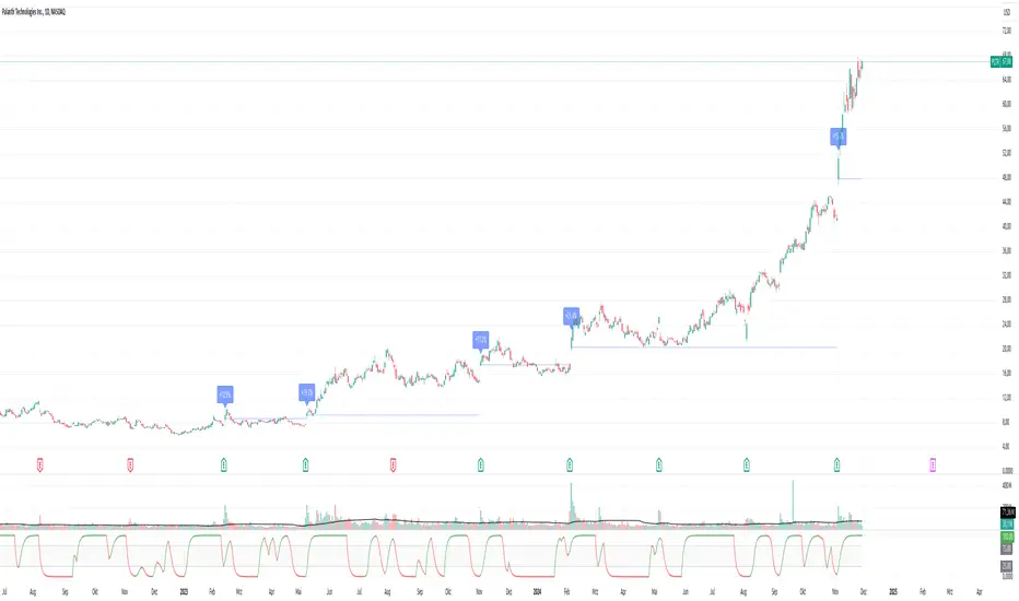 The indicator highlights price gaps (overnight gaps) with significantly increased volume in the daily chart only. These price jumps can occur after earnings reports or other significant news and often point to an important event (e.g., a new product or business model). According to Jesse Livermore, these are called Pivotal Points.The price jumps displayed by the indicator are not a guarantee that they represent a true Pivotal Point, but they provide a hint of a significant business development - especially when they occur repeatedly alongside revenue growth. This can help identify potentially strong growth stocks and high-performing investments. However, the underlying events and connections must be investigated through additional research.