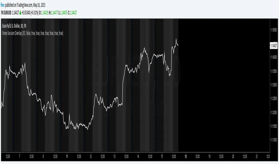 Applies gray background coloring for each major active Forex session, the more sessions active the lighter the background. Adjusted coloring for low (Sydney, Tokyo) and high (Frankfurt, London, New York) liquidity. Market opening hours for Sydney, Tokyo, Frankfurt, London and New York have been set to 08:00 - 17:00 local time and are converted to EST while taking daylight saving time into account across regions (REMEMBER: configure manually!). Sessions can be turned on or off separately. By default this indicator hides itself in larger time-frames (>30min by default). Enabling session breaks or daily pivots helps distinguish between sessions.