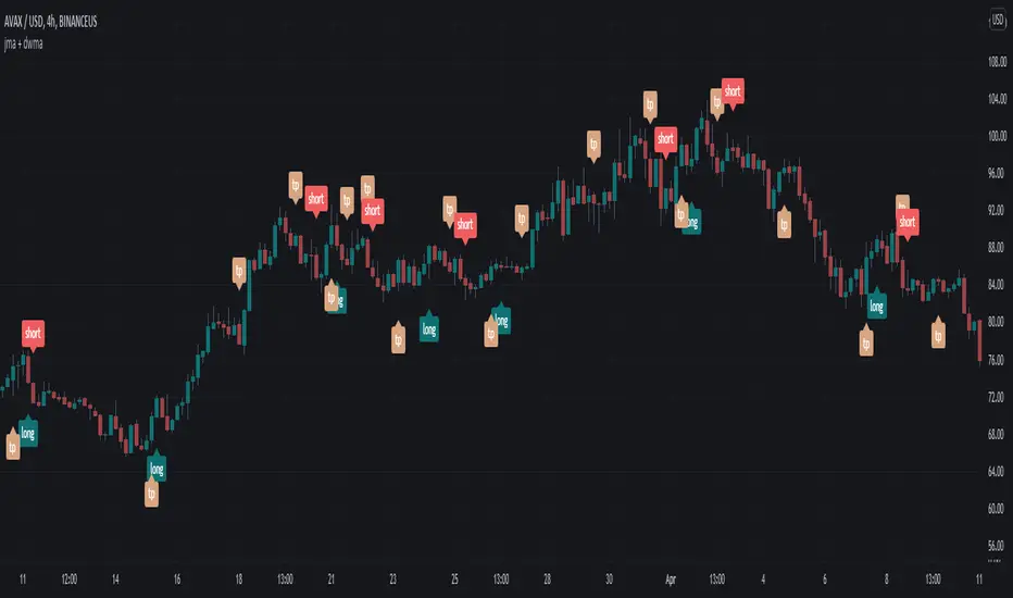 The indicator consists of the faster Jurik Moving Average (JMA) and the slower Double Weighted Moving Average (DWMA). A long signal is shown when the JMA line crosses above the DWMA line (indicating a possible reversal in trend). A short signal is shown when the JMA line crosses below the DWMA line. Take profit signals are shown when the JMA line reverses directions. Alerts for signals are included in this indicator.