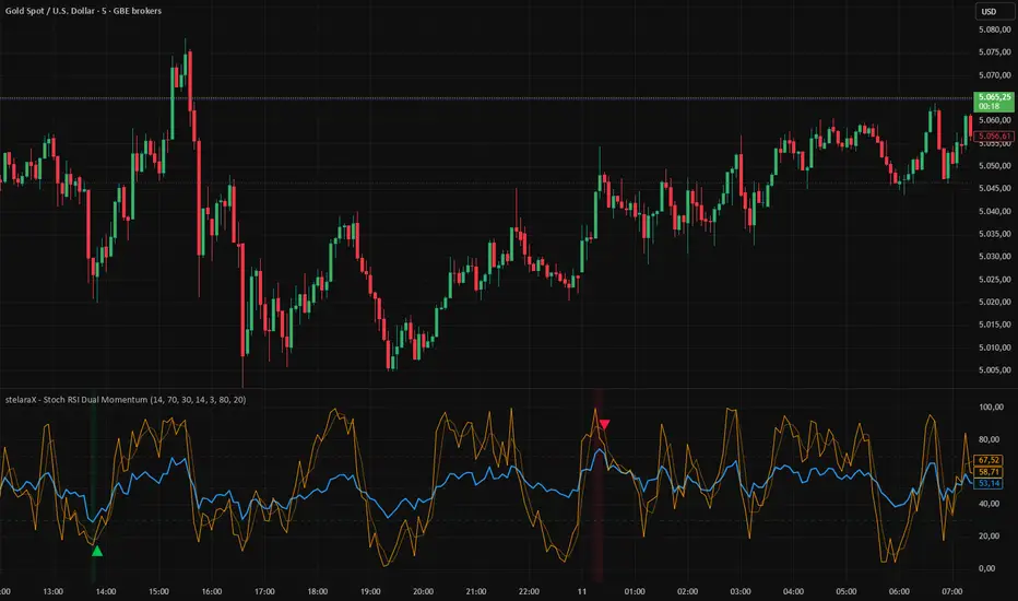 stelaraX – Stoch RSI Dual Momentum is a dual-oscillator momentum indicator designed to highlight high-conviction overbought and oversold conditions when RSI and Stochastic simultaneously reach extreme zones. It adds simple reversal triggers when both indicators exit the extreme area, helping traders time potential mean-reversion swings more selectively.