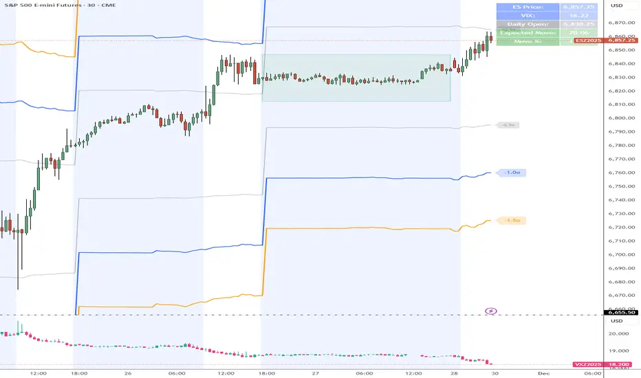 This indicator plots dynamic intraday price bands for ES futures based on real-time volatility levels measured by the VIX (CBOE Volatility Index). The bands evolve throughout the trading day, providing volatility-adjusted price targets.