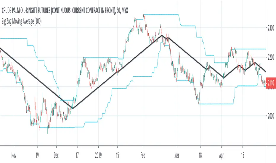 The black line is a zig-zag version of moving average and lower and upper aqua band is moving average of highest and lowest. These two objects calculated and move independently but they share the same length. You may change the length of moving averages to your liking.