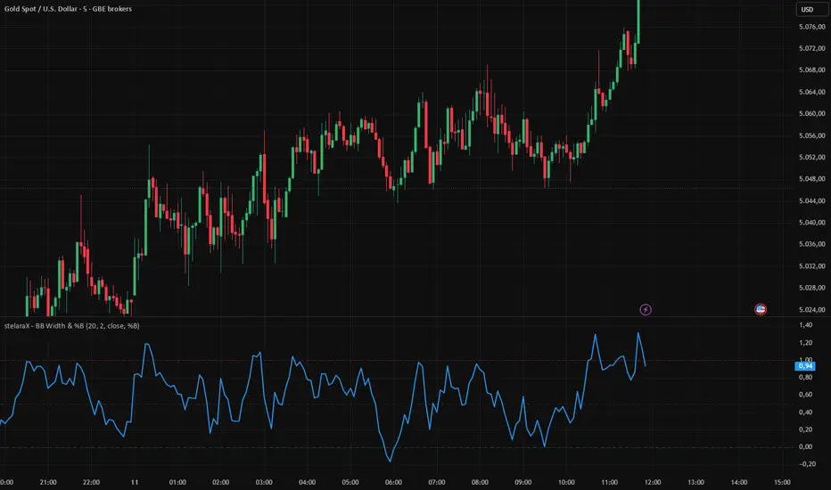 stelaraX – BB Width & %B is a Bollinger Bands analytics indicator designed to quantify volatility and price position within the Bollinger envelope. It combines two key Bollinger derivatives: BB Width (volatility expansion/compression) and %B (relative position of price inside the bands), with an optional squeeze detector based on multi-month width lows.